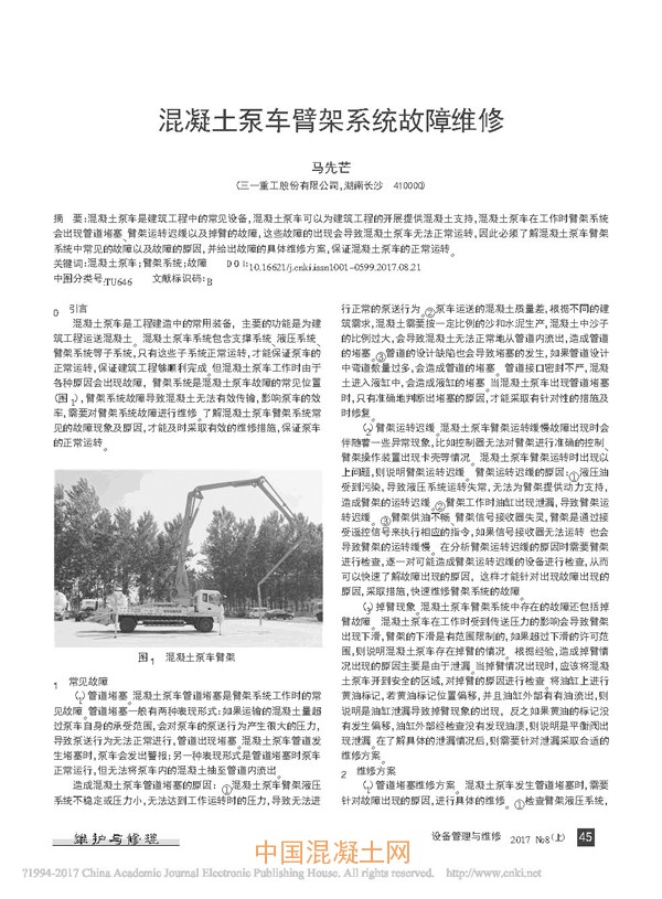 核心提示:混凝土泵車是建筑工程中的常見設備,混凝土泵車可以為建筑工程的開展提供混凝土支持,混凝土泵車在工作時臂架系統會出現管道堵塞、臂架運轉遲緩以及掉臂的故障,這些故障的出現會導致混凝土泵車無法正常運轉,因此必須了解混凝土泵車臂架系統中常見的故障以及故障的原因,并給出故障的具體維修方案,保證混凝土泵車的正常運轉。