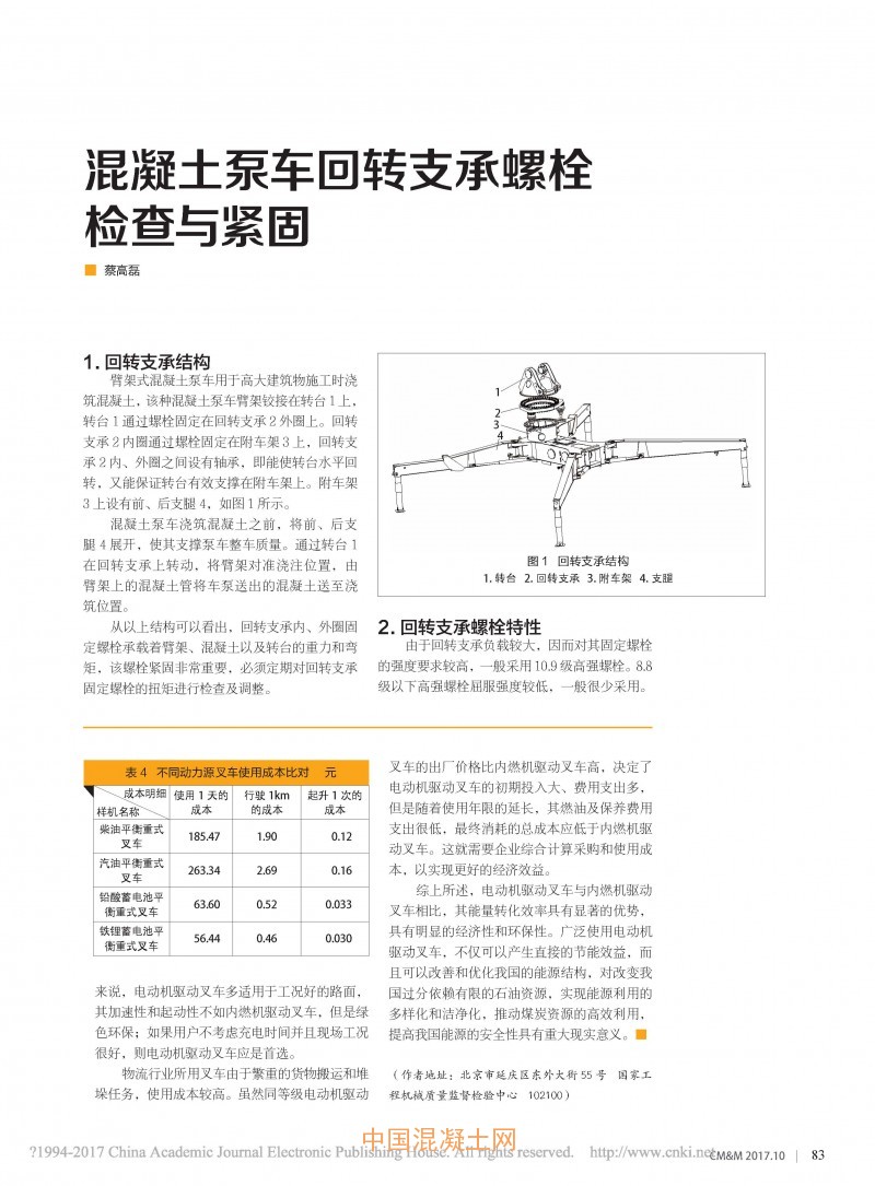 核心提示:回轉支承結構臂架式混凝土泵車用于高大建筑物施工時澆筑混凝土,該種混凝土泵車臂架鉸接在轉臺1上,轉臺1通過螺栓固定在回轉支承2外圈上。回轉支承2內圈通過螺栓固定在附車架3上,回轉支承2內、外圈之間設有軸承,即能使轉臺水平回轉,又能保證轉臺有效支撐在附車架上。附車架3上設有前、后支腿4,如圖1所示。混凝土泵車澆筑混凝土之前,將前、后支腿4展開,使其支撐泵車整車質量。