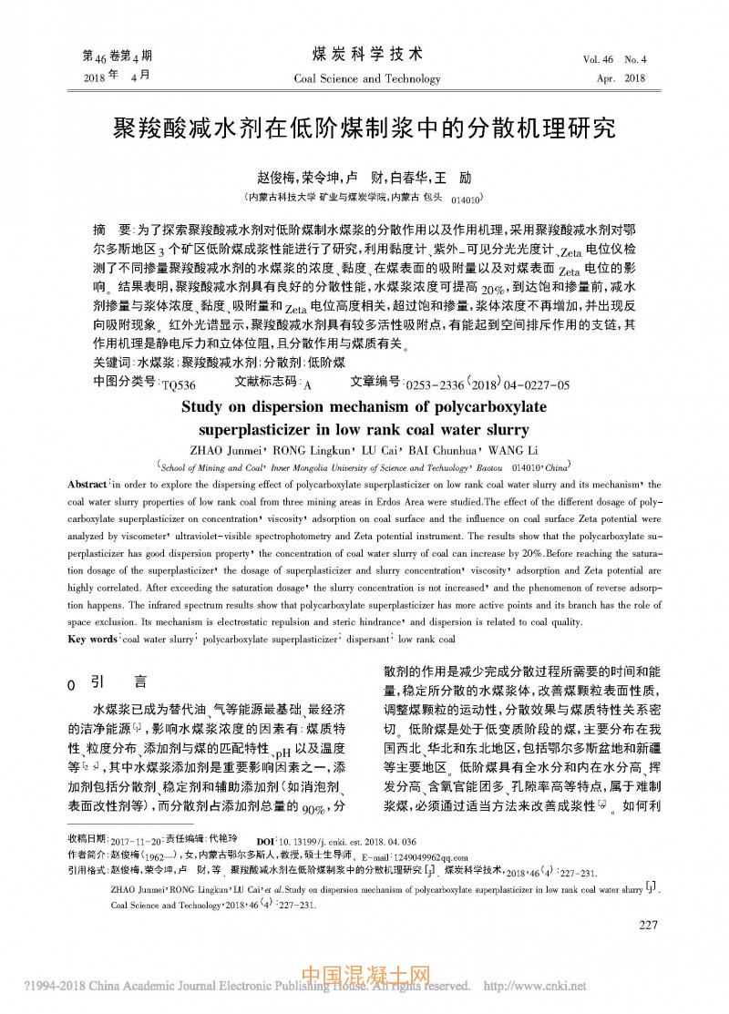 聚羧酸減水劑在低階煤制漿中的分散機理研究