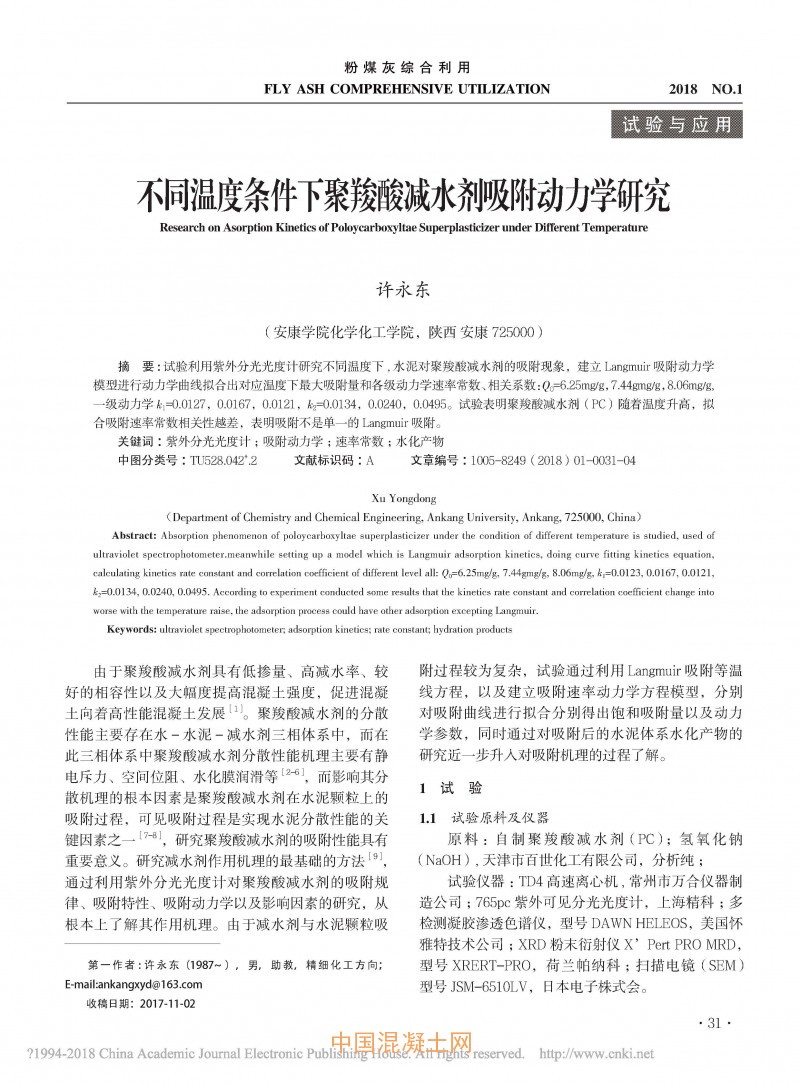 點擊下載全文:不同溫度條件下聚羧酸減水劑吸附動力學研究