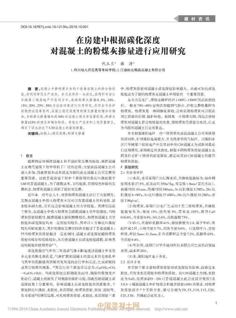 核心提示:混凝土中摻粉煤灰有利于改善混凝土的拌合物性能,有利用降低生產成本。本文采用同一水膠比,在綿陽市濱江華城第三期房地產開發項目中,選取粉煤灰摻量0、5%、10%、15%、20%、25%、30%為試驗對象進行應用研究,其同條件養護齡期測試結果表明,混凝土碳化深度隨粉煤灰摻量的增加而增加,當粉煤灰摻量增加到30%時混凝土碳化率顯著提高,粉煤灰摻量≦25%時碳化率增加較緩。考慮生產成本和工程質量要求,確定了該水膠比下C30混凝土的最佳摻量。
