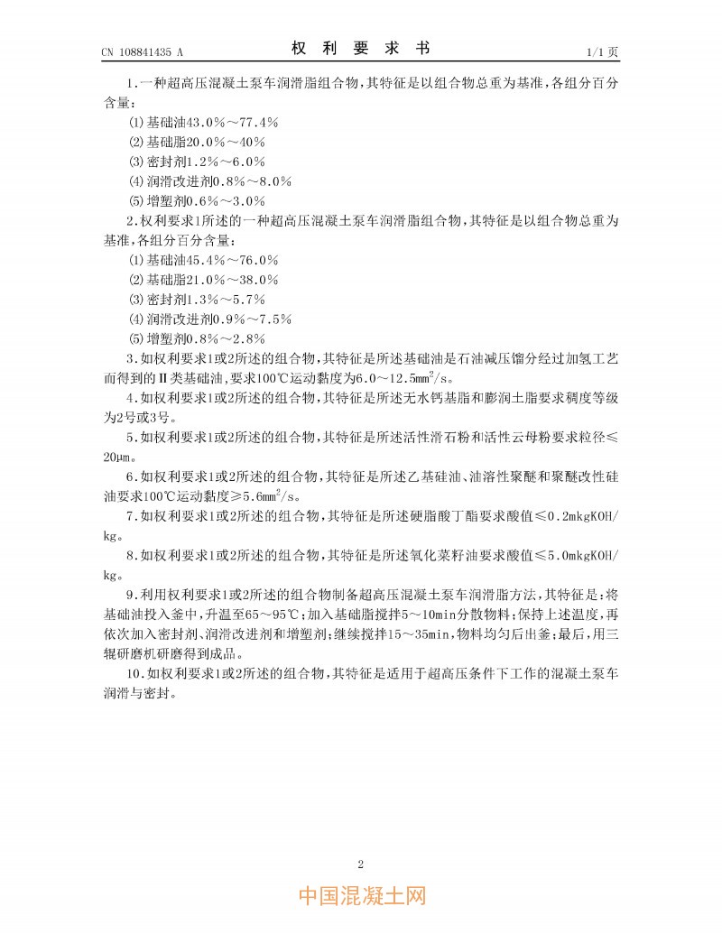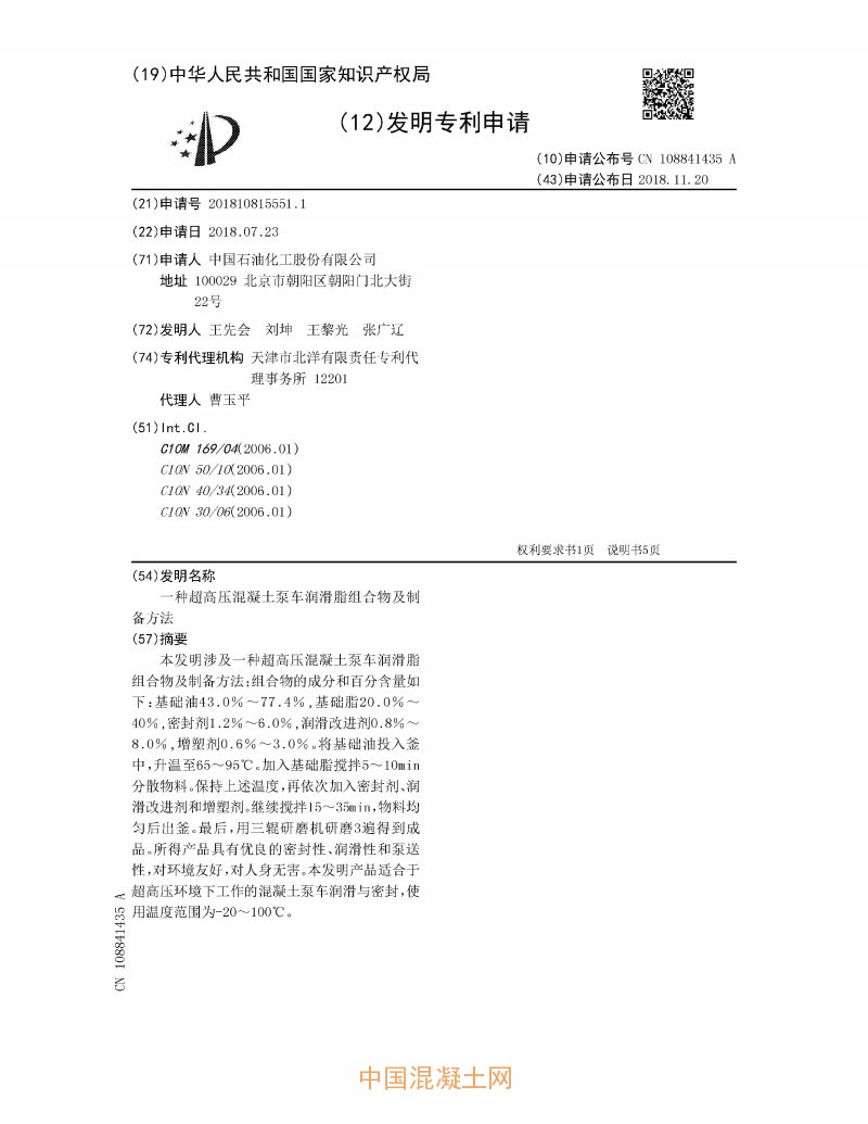 一種超高壓混凝土泵車潤滑脂組合物及制備方法(公開號:CN108841435A)