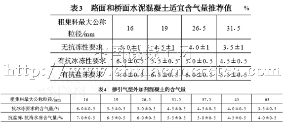 (2) 針對國內(nèi)高寒和寒冷地區(qū)高等級公路水泥混凝土路面、路緣石及路肩石冰凍和鹽凍破損相當嚴重、且數(shù)量很大的情況, 公路水泥混凝土暴露結(jié)構(gòu)表面除施工期抗凍外, 還應(yīng)有長期抗凍耐久性要求。因此要求水泥混凝土路面、鋼筋混凝土橋(涵) 面鋪裝層、混凝土緣石、混凝土護欄、水位變動區(qū)的橋梁下部結(jié)構(gòu)和涵洞應(yīng)在使用防凍劑的同時, 摻入引氣劑或復合制成的引氣防凍劑、引氣(高效) 減水防凍劑。即使正常施工季節(jié), 可不摻用防凍劑, 也應(yīng)摻入引氣劑來抵御營運期凍害, 提高水泥混凝土結(jié)構(gòu)和構(gòu)件的抗凍耐久性。水泥混凝土含氣量應(yīng)符合表3和表4 規(guī)定。