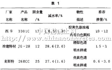 選擇目前國內市場較具代表性的3 種聚羧酸外加劑產品,其中包括兩種國外品牌產品和一種國內品牌產品。三種外加劑的有關技術參數試驗結果列于表1 中。