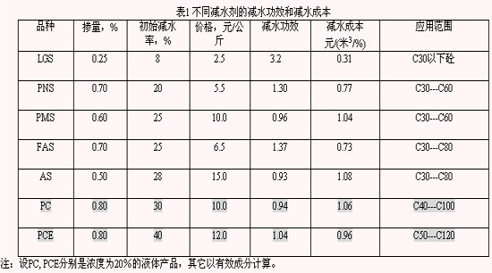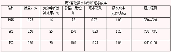 與外加劑的減水功效相對應的是減水成本的概念。減水成本可簡單地定義為減水功效的倒數。減水功效越高,減水成本越低。從物理量綱來看,減水成本即是單方混凝土摻加外加劑引起的成本增量指標,其含義是單方混凝土中單位減水率的成本。
