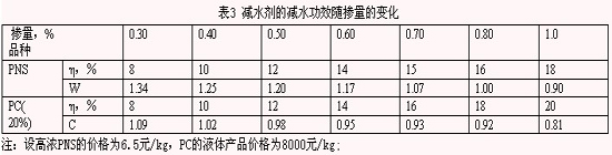 同一種減水劑在不同摻量下,其減水功效是不同的。以PNS和PC高效減水劑為例,在固定混凝土的配合比的條件下,其減水功率隨摻量的變化如表3所示。水泥用量為C=307 kg/m3。兩種減水劑的減水功效都隨摻量增加而有所降低,但PC降低的幅度小于PNS。其它類型的減水劑也有類似的規律,具體數據與配合比有密切的關系。