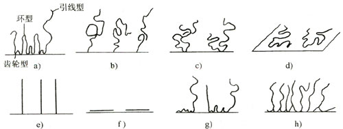 a )同聚物(環行、齒輪型、引線型) b )末端吸附(引線型) c )點吸附( 2 根引線型) d )平面狀吸附 e) 剛性垂直鏈吸附 f )剛性鏈橫臥吸附 g )左: AB 型 右: ABA 型塊狀聚合物的環型、齒輪型、引線型 h )接枝共聚物的齒型吸附
