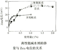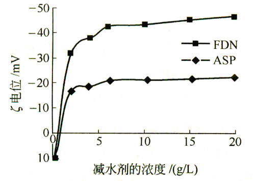 水泥顆粒表面 ζ 電位與減水劑濃度的關系 |
