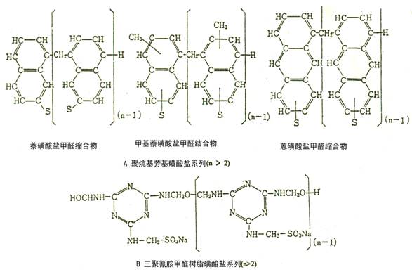 萘系( Naphthalin ),三聚氰胺系( Melamine ),氨基磺酸系( Aminosulfonic acid ),多羧酸系( polycarboxylic acid )。其化學結構式分別如下: 萘系 萘磺酸鹽甲醛縮合物