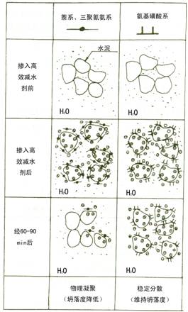 ③氨基磺酸系高效減水劑減水率高,控制坍落度損失功能好。其分子結構特點是分支較多,疏水基分子段較短,極性強。性垂直吸附,水泥粒子間是立體排斥力,對水泥粒子分散性強,并能保持分散系統的穩定。