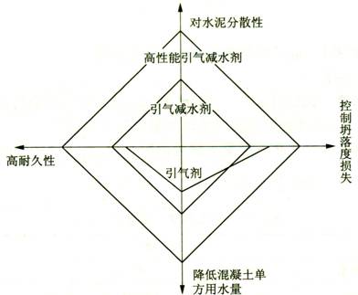 氨基磺酸系高效減水劑是氨基芳基磺酸鹽 - 苯酚 - 甲醛縮合物 (Amino-Arylsulphonate Phenol Formaldehyde Condensate ,簡稱為 ASPF) ,是一種非引氣樹脂型高效減水劑,屬低堿或無堿型混凝土外加劑,減水率 25 %以上,可配制 C50 ~ C100 的高強、超高強混凝土,而且混凝土的胡落度損失小,與普通減水劑相比具有多方面的優異性能 ( 見圖 1) , ASPF 屬高性能引氣減冰劑范疇。對水泥具有高分散能力、單方混凝土用水量低、高耐久性與控制坍落度損失功能。這也是今后發展減水劑應具備的四方面的基本功能。 在日本, 20 世紀 80 年代就已開發應用氨基磺酸系高效減水劑,但在我國現在仍處于起步階段。