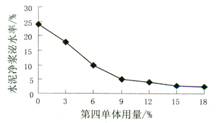 2.4 第四單體及用量對產品性能影響 傳統的氨基磺酸鹽系高效減水劑由對氨基苯磺酸鈉 ( 也可用對氨基苯磺酸代替 ) 、苯酚和甲醛三種主要原料為單體,通過三元共聚,形成具有多支鏈的網狀分子結構。其分子在水泥顆粒表面呈現立體吸附,使混凝土在較長時間內保持其坍落度及流動性。但由于其分子中疏水基鏈短、極性強,使其應用于混凝土時,會出現保水性差、易泌水現象。針對這—情況,根據“分子設計”原理,從改進傳統氨基磺酸鹽分子結構入手,加入含有聚氧乙烯基 [CH 2 CH 2 O ) n H)] 的第四種單體 ( 即改性劑 ) 。該單體在堿性環境下,能與甲醛發生交叉的羥醛反應,生成 β —羥基酮,再與羥甲基化分子發生縮合,從而增長疏水基分子鏈,優化原分子結構極性,以增強混凝土保水、抑制混凝土泌水性。據此經反復多次試驗后付諸實際生產,產品用于幾個大的商品混凝土攪拌站高標號混凝土配制,取得了很好的效果。 試驗表明,第四單體的摻加量并非越多越好。經合成試驗與產品檢測,按第四單體占 ( 對氨基苯磺酸鈉 + 苯酚 ) 質量百分比來表示,第四單體的摻加量與產品性能關系如圖 2 、圖 3 所示。