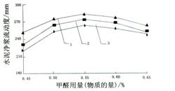 2.3 甲醛用量對合成產物的影響 甲醛分子中的羰基是強極性基團,化學性質比較活潑,易發生親核加成反應。受羰基影響,甲醛的 α -H 也具有較強的活性,加上酚羥基鄰、對位上的氫也較為活潑,使得苯酚很容易受甲醛進攻而羥甲基化。由于甲醛的用量直接影響苯酚的羥甲基化程度和類型,進而決定單體縮合分子量大小和支鏈多少,因此甲醛用量 ( 占總反應單體的物質的量 ) 對產物的分散性有很大影響。筆者通過多次試驗,保持對氨基苯磺酸鈉和苯酚用量相對固定,依次增加甲醛用量,其產物凈漿流動度變化值如圖 1 所示。