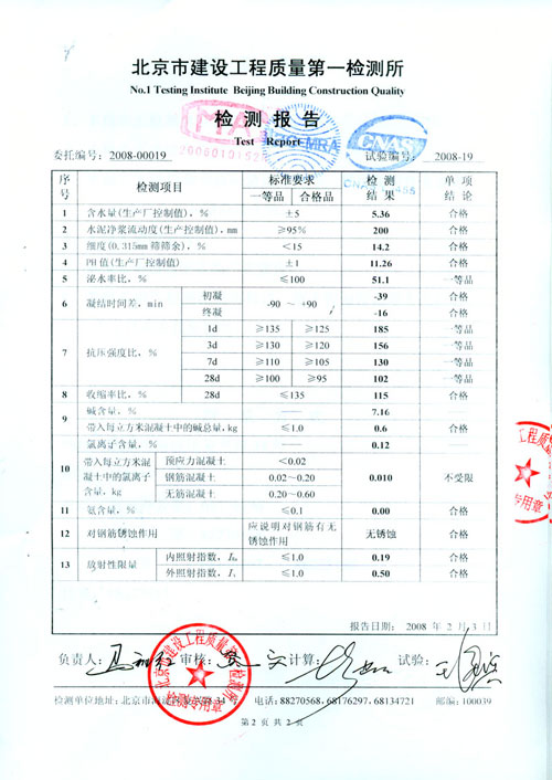 The blend dosage normally ranges from 2 %.The standard blend dosage is established at 2%. DIRECTIONS 1. The powdery agent can be agitated together with cement. Accurate measurement is essential. 2. A 30-second agitation is required to achieve good homogeneity. PACKGING,TRANSPORTATION AND STORAGE 1. Woven fabric bag with plastic liner.Net weight:25kg 0.13 or 50kg 0.25. 2. Cautions should be taken to prevent from being torn by sharp-ended objects while packages are transferred or delivered. 3. It should be stored in a dedicated warehouse that is well-ventilated and dry. It remains effective for two years. At the expration, re-use is allowed if the testing results fall within the established range. In case of humidity contamination, re-use is allowed after drying and crushing. | |||||||||||||||||||||||||||||||||||||||||||||||||||||||