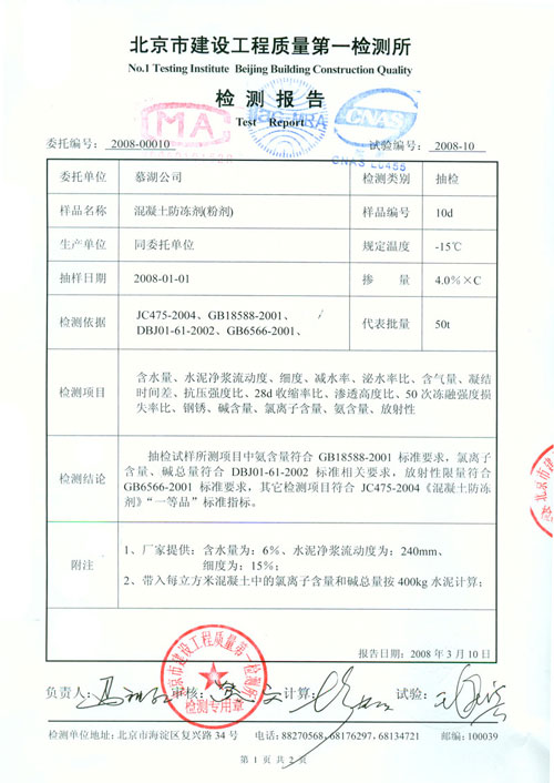 “注意:混凝土粉狀防凍劑儲運使用時嚴(yán)禁煙火,否則后果自負(fù)” 低溫或負(fù)溫對混凝土施工十分不利。環(huán)境溫度低,水泥的水化反應(yīng)慢,影響混凝土強度的增長。試驗得出:溫度每降低 1 ℃ ,水泥的水化作用降低約 5 %~ 7 %,在 1 ℃ ~ 0 ℃ 范圍內(nèi)水泥的水化活性劇烈地降低,水化作用緩慢。一般當(dāng)溫度低于 0 ℃ 的某個范圍時,游離水將開始結(jié)冰,溫度達(dá)到 -15 ℃ 左右時,游離水幾乎全部凍結(jié)成冰,致使水泥的水化和硬化完全停止。 當(dāng)水轉(zhuǎn)化為固態(tài)的冰時,其體積約增大 9 %,使混凝土產(chǎn)生內(nèi)應(yīng)力,造成骨料與水泥顆粒的相對位移及內(nèi)部水分向負(fù)溫表面遷移,在混凝土體內(nèi)形成冰聚體引起局部結(jié)構(gòu)破壞。水在 4 ℃ 時的密度最大,當(dāng)溫度降至 4 ℃ 以下時,實際上水的體積已開始膨脹,這對于新拌混凝土新形成的水泥水化物結(jié)構(gòu)會造成損害。根據(jù)試驗資料:新澆筑的混凝土過早遭受凍結(jié)將大大降低極限強度,強度損失率可能達(dá)到設(shè)計標(biāo)號的 50 %,甚至引起整體結(jié)構(gòu)破壞;但當(dāng)混凝土達(dá)到臨界強度后遭受凍結(jié),混凝土的極限強度損失較小,也不會發(fā)生整體結(jié)構(gòu)破壞。 當(dāng)混凝土的拌合水中摻入一定量的防凍劑會使水溶液的冰點降低,其冰點的降低幅度與防凍劑的種類和摻量或溶液的濃度有關(guān)。防凍劑的使用效果在很大程度上取決于溶液 ( 拌和水溶液 ) 的濃度以及混凝土硬化過程經(jīng)受的負(fù)溫值。 混凝土內(nèi)摻入防凍劑的主要目的是使其在負(fù)溫下保持足夠的液相,使水泥的水化得以繼續(xù)進(jìn)行;轉(zhuǎn)入正溫后,混凝土強度能進(jìn)一步增長,并達(dá)到或超過設(shè)計標(biāo)號。 執(zhí)行標(biāo)準(zhǔn)《混凝土防凍劑》( JC 475-2004 )