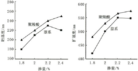 混凝土工作性,總體上可分為流動性指標和穩定性指標。摻加聚羧酸減水劑的混凝土和易性比較好,在較高的摻量或較高用水量時也不會發生明顯的離析、泌水,混凝土在模板中的沉降也較小,也就是說從穩定性指標來說,聚羧酸減水劑與水泥的適應性要明顯好于萘系減水劑。但從流動性指標來說,并不盡然。