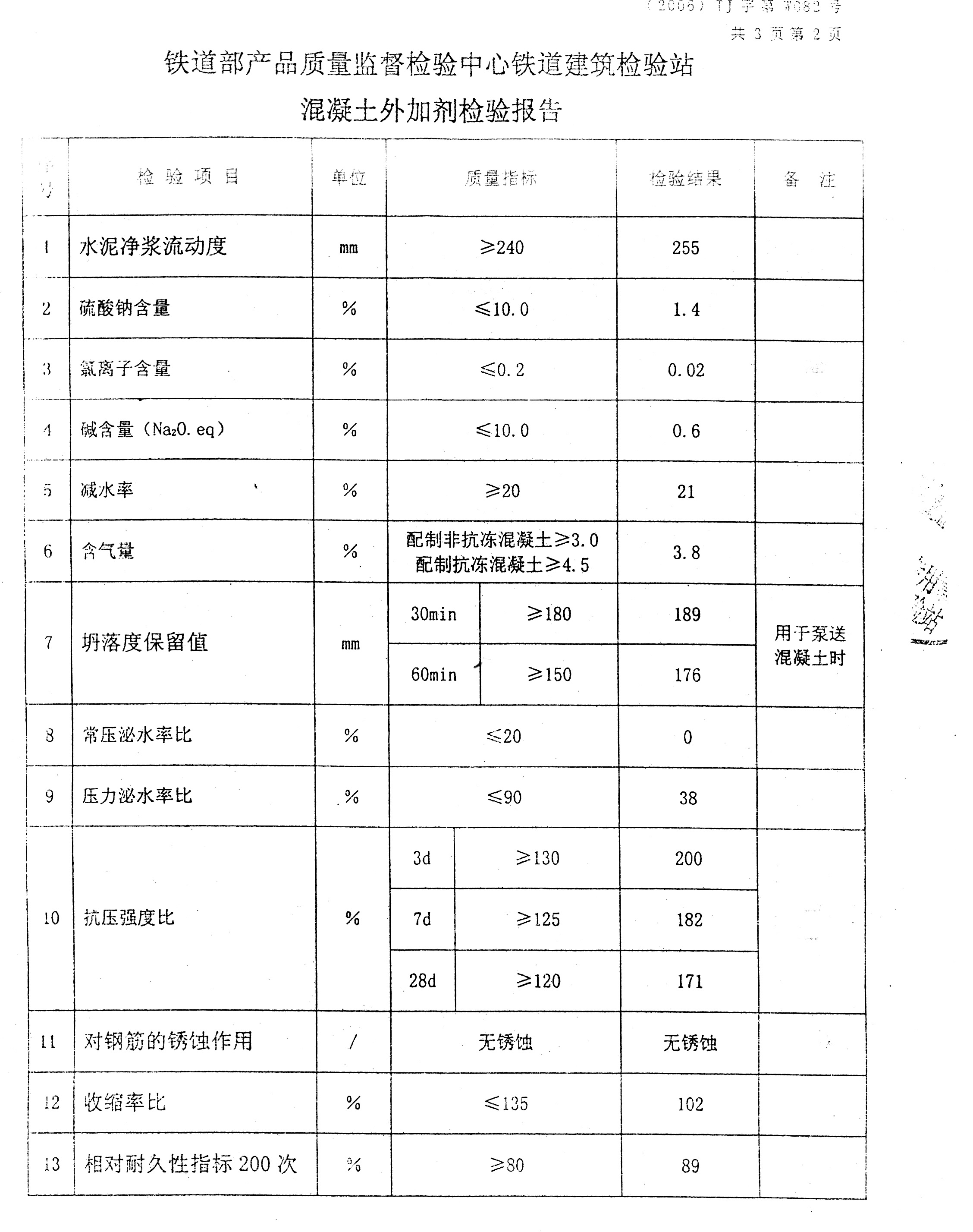 (3) 具有適當引氣、高增強、低收縮性能.能配制出超高強和超耐久性混凝土:混凝土含氣量不大于 2 5 %,泌水率比小于 100 %,抗凍等級在 50 次以上,收縮率比不大于 115 %。另外,外加劑引氣量可根據混凝土的具體抗凍耐久要求進行調整。