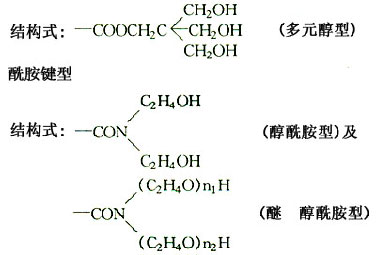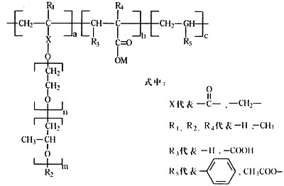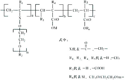 4 、無反應活性的非主導官能團常以醚鍵、酯鍵、酰胺鍵型等型式存在。這三種鍵型屬非離子型表面活性物質,可以單獨一種或任意兩種或三種同時與羧基或“羧酸—磺酸”組成高性能外加劑,這三種鍵型是 醚鍵型 結構為: 酯鍵型