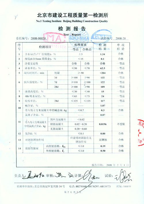 During the water-chemical action of the cement mortar, soluble material can be solidified, and generate water-addition material, intense conglutination of the mortar, which has no effect on the mortar's stability and water-resistant capability, and can facilitate concretion and hardness of the mortar, avoid forming the water-resistant crystal in branch shape when the cement mortar is hardened, reduce the dry shrinkage, control crack, so it is the cement waterproof material which replaces the water. It is a healthy and environmental waterproof material with poison-free and odor-free performance.