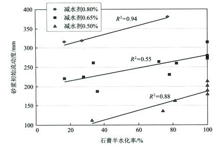 圖 6 石膏半水化率與砂漿初始流動度的關(guān)系