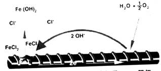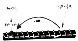氯離子穿透或活化氧化物保護膜,會使鋼筋各部位的電極電位不同而形成局部電池,發生電化學反應: