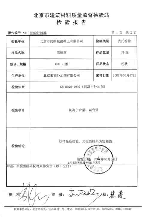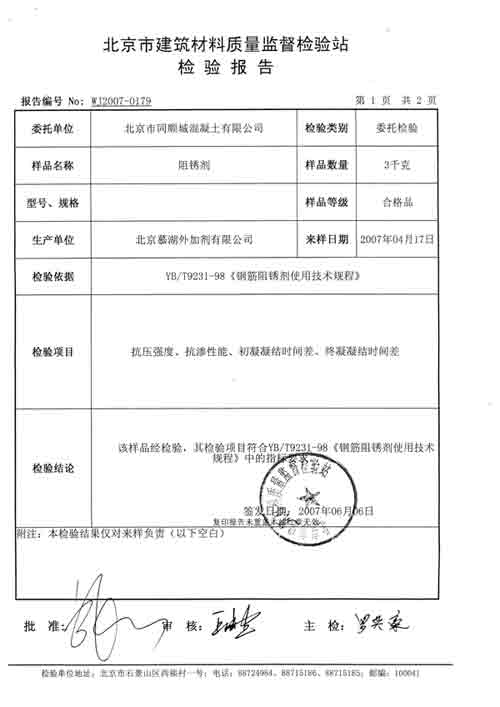 六、使用說明 1、推薦摻量為:(1)一般工業民用建筑、橋梁等輕微腐蝕環境,推薦摻量建議為4~8㎏/m3。(2)海港工程、沿海建筑等重度腐蝕環境,推薦摻量建議為8~12㎏/ m3。2、將本品與水泥、集料同時加入攪拌機內進行干攪,攪拌均勻后再加水進行攪拌,并適當延長攪拌時間,確保混凝土攪拌均勻。3、與其它外加劑復合使用時,應先做混凝土試配,以確定其適應性;不得使用引氣型減水劑。配制混凝土所用原料應符合《建筑用卵石、碎石》GB/T14685-2001和《建筑用砂》GB/T14684-2001。4、本品為25公斤袋裝,儲存期一年,如有輕微吸潮結塊可溶于水中使用,在運輸、儲存過程中應避免雨淋、受潮,陰涼通風保存,遠離易燃易爆物,嚴禁明火;操作人員宜佩帶口罩、橡皮手套。 七、注意事項 1、一般采用干摻法,也可溶于拌合水中(包括部分不溶物)。一定要攪拌均勻,可適當延長攪拌時間。本品略有減水作用,可在保持原流動度的情況下適當減水。2、在與其他外加劑共用時,應先行摻加本品,待與水泥(混凝土)均勻混合后再加入其他外加劑。3、本品在高質量混凝土中才能更有效地發揮作用,必須遵守相關規范和設計規定,先做混凝土配合比試驗,確保混凝土質量與密實性。4、納入鋼筋阻銹劑的相關規程、規范:《工業建筑防腐蝕設計規范》、《海工混凝土結構設計規范》、《鹽漬土建筑規程》、《公路工程外加劑規范》等。 |