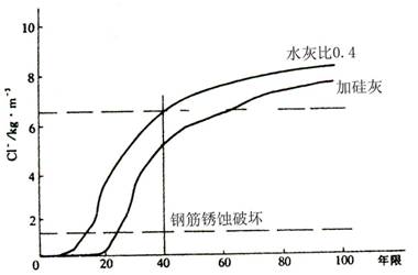 研究與實踐表明,鋼筋周圍 C1-- 累積量達到 1kg /m 3 混凝土時,鋼筋銹蝕可導致混凝土開裂 ( 海洋環境 15 年左右可達此值,加硅灰可延至 20 年 ) 。摻加足量的鋼筋阻銹劑可不發生鋼筋銹蝕破壞,如設計壽命 40 年,鋼筋周圍 C1-- 累積量達到 6. 3 ㎏ /m 3 ( 圖 3 . 0 . 2) ,按比例摻加 7.5kg /m 3 的鋼筋阻銹劑,即可保證 40 年的使用壽命。