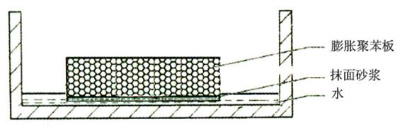 (1) 參照 JC/T933 — 2006 《外墻外保溫用膨脹聚苯乙烯抹面膠漿》,按照?qǐng)D 1 方法取上述試件四周用防水材料密封處理,以保證在試驗(yàn)過程中只有抹面砂漿吸水。用天平稱量制備好的試件質(zhì)量 m 0 ,然后將試件在 23 ℃ ± 2 ℃ 水中浸泡 24h ,浸入水中的深度為 2~ 10mm , 24h 后取出用濕毛巾迅速擦去試件表面水分,稱其質(zhì)量 m 1 。吸水量按照下式計(jì)算: