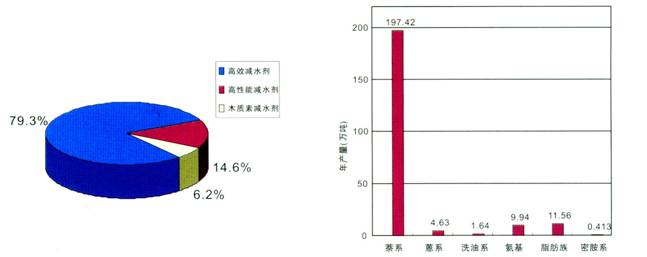 近兩年來,高性能減水劑發(fā)展迅猛,以聚羧酸鹽類為主要成分的高性能減水劑具有一定的引氣性,較高效減水率和良好的坍落度保持性能,是環(huán)保型的外加劑,近兩年得到了大量推廣應(yīng)用。 2007 年國內(nèi)年產(chǎn)量已達 41.43 萬噸,其發(fā)展速度是非常快的。許多廠家生產(chǎn)能力都比較大,但尚處于以銷定產(chǎn)的狀態(tài)。
