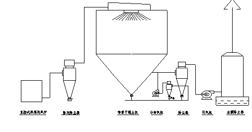 由熱風(fēng)爐燃燒產(chǎn)生的高溫?zé)犸L(fēng),從干燥室頂部蝸殼通道,由熱風(fēng)分配器產(chǎn)生均勻旋轉(zhuǎn)的氣流進(jìn)入干燥室內(nèi)。物料通過高速旋轉(zhuǎn)的霧化盤,產(chǎn)生分散微細(xì)的料霧,料霧與旋流的熱空氣接觸,水分迅速蒸發(fā),在極短的時(shí)間物料得以干燥,得到中空、壁薄的球狀產(chǎn)品,該產(chǎn)品在水中能迅速溶解。