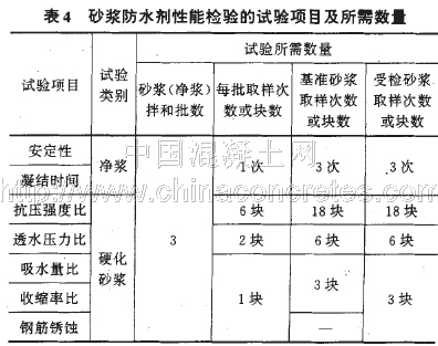 砂漿防水劑性能檢驗的試驗項目及所需數量應符合表4的規定。