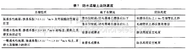 公路防水混凝土工程的設防高度應根據結構物周圍的土質和地下水情況根據經驗參照表7確定。