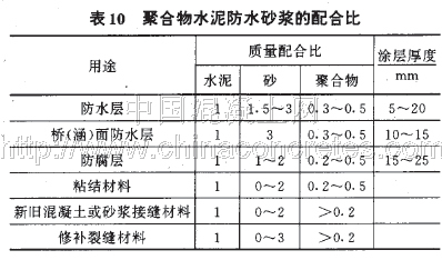 (1)對用于承受沖擊、振動、疲勞動載的地上和地下的公路工程的防水砂漿以及受腐蝕和凍融循環的公路砌體結構中的防水砂漿,首推聚合物改性水泥防水砂漿。其性能應符合表9的規定,配合比可參考表10,
