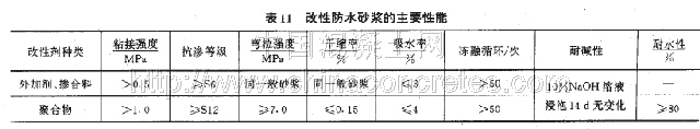 (4)防水砂漿宜摻入外加劑、摻合料、聚合物等進行改性,改性防水砂漿的性能應符合表11的規定。