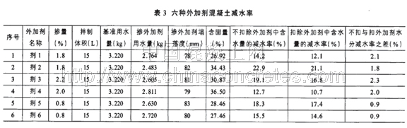 同樣,在對混凝土減水率計算中也存在著與砂槳減水率相同的問題,應予以等同對待。在標準GB 50119中已經明確提出,“減水劑以溶液摻加時,溶液中的水量應從拌合水中扣除”。我們同樣也可以得出一部分相關數據(表3 )。