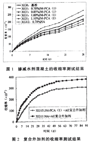 因此 ,與 NA減水劑和NA復(fù)合外加劑相比,JM-PCA(I)減水劑和JM-PCA ( I)復(fù)合外加劑均有利于降低混凝土的收縮,提高混凝土抗裂性能。