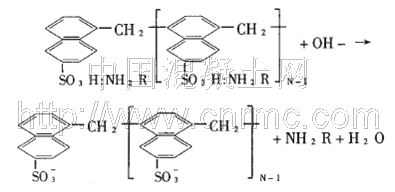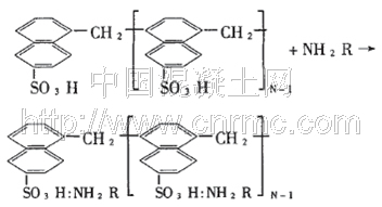 磺酸是一種有機強酸,不便于運輸和存放,所以萘系減水劑都是以磺酸鹽的形式供應的。萘系減水劑一般用燒堿進行中和,得到的是萘磺酸甲醛縮合物的鈉鹽。為了實現緩釋性能,試驗中引人了一種有機堿,利用胺基上氮原子具有一對孤對電子的特性,通過形成共價鍵與磺酸基結合起來:
