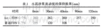 如表1所示,由于Act-FDN的溶出有所滯后,相當于減水劑的后摻法,對提高其作用效率是有利的,雖然在溶液中的初始濃度不高,分散效果仍然很好。隨著水泥水化的進行,液相中減水劑的濃度也逐漸升高,水泥凈漿流動度不但不降低,在初期反而還有所升高。