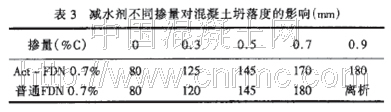 在0. 7% C(水泥重)的典型摻量下,Act-FDN的初始坍落度略低于高效減水劑FDN,這是其緩釋性能導致的直接后果;但是,坍落度保持效果大為改善,且對早期強度(ld)幾乎沒有影響。如果用FDN復合適量緩凝劑而達到相同的坍落度保持效果時,則會嚴重降
