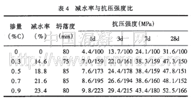 在一定的水泥用量(330kg/m 3)和用水量(205kg/m3)的條件下,混凝土的坍落度隨減水劑的摻量增加而
