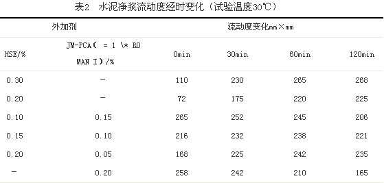 凈漿試驗結果見表2,單摻HSE外加劑的初始凈漿流動度很小,然而過了30分鐘后凈漿流動度突然變大,并且在60分鐘和120分鐘之間達到最大值。與此同時摻JM-PCA( = 1 * ROMAN I)的水泥凈漿流動度隨時間的延長,有所下降。當HSE和JM-PCA( = 1 * ROMAN I)復配使用,摻量略有提高,但流動度隨時間延長還反而增加,說明HSE初始減水效果一般,但對降低流動度損失卻是十分有利的。