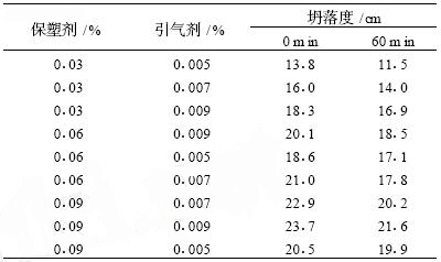 試驗結果(見表3)表明,聚羧酸類引氣劑具有較好的塑化、保塑作用,例如:當引氣劑用量為
