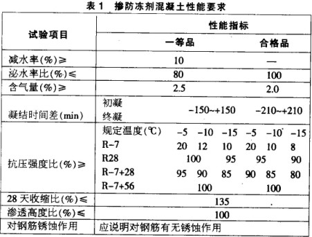 分別明確該防凍劑在不同試驗溫度(-10℃、-15℃)、不同摻量(2.0%、3.0%)的情況下對混凝土抗凍性能的影響情況。混凝土性能試驗參照JC475-2004這一標準分別測定新拌混凝土及硬化混凝土的各種性能。各種性能要求見表1。