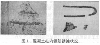 某大型公共建筑,地上4層,地下1層,框架結(jié)構(gòu),基礎(chǔ)為樁基,抗震設(shè)防烈度為7度:混凝土構(gòu)件設(shè)計強度等級:-6.5~17m的柱為C40,梁、板為 C30。興建于1995年,竣工于1998年,室內(nèi)要求恒溫21℃。5年后,發(fā)現(xiàn)2層部分框架柱外貼石材出現(xiàn)縱向裂縫,敲擊有空鼓聲,觀察發(fā)現(xiàn)裂縫有發(fā)展趨勢。將柱裝飾石材和裝飾用混凝土層局部剔除后,發(fā)現(xiàn)柱混凝土沿鋼筋方向開裂,混凝土保護層疏松、酥裂,敲擊有空鼓聲,局部剝離混凝土保護層,發(fā)現(xiàn)柱內(nèi)一些鋼筋銹蝕嚴重(見圖1)。