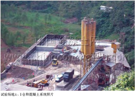 試驗場地選擇: 根據黃花寨水電站地理位置、氣候條件和骨料巖性,經各方研究選擇與其條件相似的落腳河水電站工地進行試驗,其優點是有較好的試驗場地,完整的砂石和混凝土拌合系統,施工隊伍是將承擔黃花寨水電站的中標單位,又有新購進的德國寶馬BW202AD振動壓路機。缺點是混凝土拌合樓能力較低,可能對碾壓試驗產生不良影響。