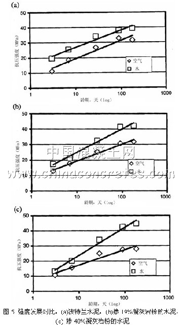 在這里必須強調的是摻有混和材(礦渣、粉煤灰、火山灰質混和材)的水泥特別需要很好的養護,國外一再倡導的高摻量粉煤灰水泥(high volume fly ash cement),其強度11年后甚至超過純硅酸鹽水泥。但必須記著其條件是水中養護或濕空氣中養護。必須再三強調的是這些混和材要能發揮作用,一定要為其創造水化的條件。若施工2~3天就脫模,不能保持必要的濕度,由于混和材發生化學反應的速度是很慢的,特別是粉煤灰往往要在長期養護中才能水化,因此對于摻有混和材的水泥,養護更特別重要。圖5示出土耳其科學家最近的研究結果[3],從圖中可以看出,空氣中養護和水中養護強度的差異,對摻有凝灰巖粉的水泥水中養護強度要大得多。