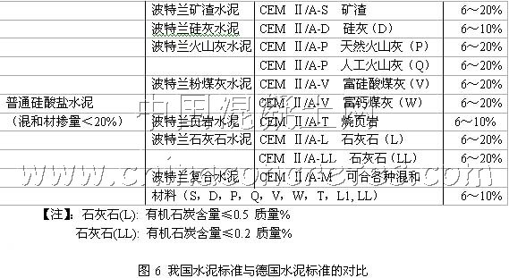 這里還必須提出需要混凝土工作者注意的是,我國從2008年6月1日起將實行新的水泥標準,新標準規定將原普通硅酸鹽水泥中混和材的最大摻量由15%放寬到20%。這就等于將德國(歐洲相同)的詳細分成十個品種的水泥,在我國統稱其為“普通硅酸鹽水泥”(見圖6)