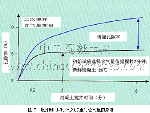 總體來說,我國建筑業尚未擺脫“粗放型”的操作方式。但由于科技進步,現在的情況比過去復雜得多。水泥品種眾多,混合材也多種多樣,摻量也很不相同,外加劑廣泛應用,魚目混雜,質量相差甚遠,砂石材料的供應也不規范。因此要從“粗放”走向“精細”,材料的優選優配就顯得十分重要。但是僅憑實驗室確定的配合比和預期性能,并不能代表現場構筑物的真實情況。國外資料表明,建筑的破壞因素,施工不良占有27%,估計就我國情況而言,這個比例還要大得多。因此鑒定和測試必需包括對施工質量的監測。對機場道面、道路、橋梁現場取樣鑒定就十分必要。這包括真實混凝土的水灰比、水泥摻量、配合比以及成熟度、均勻度等的測定,特別還有現場混凝土的含氣量。國內外的資料一致證明摻引氣劑是提高混凝土抗凍性和抗除冰鹽腐蝕的最有效的措施,但現場混凝土的含氣量不僅決定于引氣劑性能、摻量以及混凝土的配合比,而且與攪拌方式、時間、運輸過程以及現場的施工方法和再攪拌等因素密切相關。德國【5料表明攪拌方式不同含氣量可以相差一倍(圖7),而含氣量的對少對混凝土的力學性能有顯著影響,同時引氣劑的效果不僅與含氣量大小有關,還與引氣劑產生的微氣泡尺寸及尺寸分布和微氣泡的間距有關,不仔細鑒定是無法得知這些信息的。因此我們應該把對原材料、配合比的監控延伸到施工后真實混凝土的監控,這將顯著提高構筑物的質量。