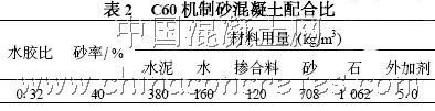 原材料選定后進行試配試驗,選定水膠比分別為:0135 、0132 、0129 、0126 、0123 進行系列試配。用水量控制在150~165kgPm3 ,高效減水劑摻量控制在015 %~112 % ,機制砂由于細度模數較大,砂率的選定宜略大,同時加大優質粉煤灰的摻量。在經過反復試驗的基礎上,提出C60 機制砂混凝土配合比如表2 所示。