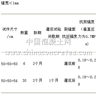 凝土澆筑時發生的初凝事故會留下冷縫,一般冷縫由于張開度很小,且可能有一些影響灌漿質量的冷縫表面膜,因而不易進行灌漿處理。而冷縫最大的危害性在于漏水,使大壩抗滑穩定性遭到破壞,因此在處理冷縫事故時,應當采取措施增強壩體的防滲性。壩體混凝土溫度裂縫只要張開度≥lmm,一般可以采用水泥灌漿進行處理,在試驗室中裂縫灌漿試驗如下表: